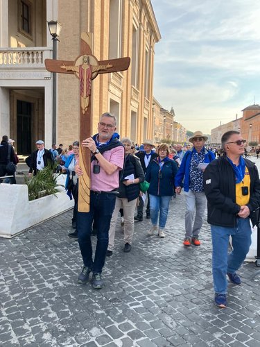 Der Morgen des zweiten Tages startete mit einem beeindruckenden und bewegenden Pilgerweg von der Engelsburg über die Via de la Conciliazione, über den Petersplatz in die Peterskirche. Gemeinsam beteten wir, verbunden über die Kopfhörer, vorne weg abwechselnd Pilgerinnen und Pilger, die ein Holzkreuz trugen und die Gruppe leiteten. Das Tragen des Kreuzes löste tiefe Berührung aus. Der Weg führte vom Obelisken auf dem Petersplatz hinein in den Petersdom durch die Heilige Pforte. Angekommen im Petersdom feierte die Reisegruppe einen Gottesdienst. Ein erhabenes Gefühl machte sich breit, in diesem denkwürdigen Dom, gemeinsam eine Messe zu feiern.