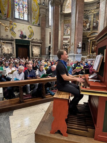 Am Nachmittag gab es für die Pilgerinnen und Pilger Gelegenheit, um in der deutschsprachigen Gemeinde S. Maria dell`Anima zu beichten oder an einer Probe des Wallfahrtschors teilzunehmen und mitzusingen. Der Wallfahrtschor, der von Diözesankirchenmusikdirektor Martin Erhard geleitet und gemeinsam mit Christoph Angeli dirigiert wurde, gestaltete musikalisch eine Andacht, die die Pilgerinnen und Pilger sehr bewegte. Kerstin Fleischer, Leiterin der Hauptabteilung Seelsorge und Organisatorin der Romwallfahrt und Regens Franz Vogelgesang, der ebenso Teil des Orga-Teams ist, trugen abwechselnd Gedanken zu den einzelnen Strophen des Liedes „Unser Suchen nach dem Einen“ aus dem Liedheft zur Romwallfahrt vor. Am Ende gab es langen Applaus für die tollen Gesangsbeiträge des Wallfahrtschors. Ein wahrlich stimmungsvoller Ausklang, gefüllt mit Hoffnungsklängen für den Abend und den morgigen Tag.