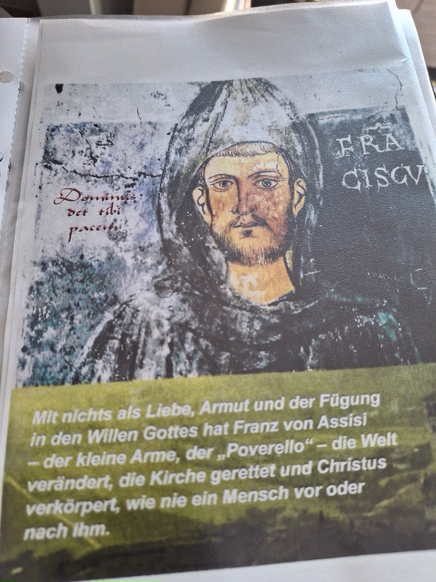 "Du, ich bin der Franz, der aus Assisi. Kennst du mich? Was weißt du von mir? Was bedeute ich dir?" Impuls auf der Fahrt zum Franziskusweg und Bild des Heiligen in Subiaco, das noch zu seinen Lebenszeit gemalt wurde. Wir Pilger sind aufgebrochen, Franziskus kennenzulernen, ihm zu begegnen und seine Botschaft für unser eigenes Leben zu ersparen. Mal gespannt, was wir auf dem Weg miteinander alles entdecken.