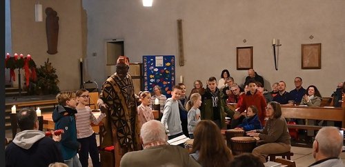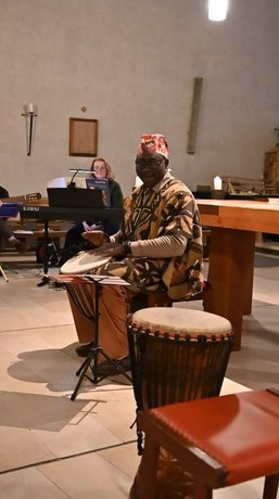 Zu einer gelungenen Mischung von Redebeiträgen und Liedern zum Mitsingen der Gemeinde kamen nun auch die Lieder und Trommelrhythmen von Pfarrer Sama und mit ihnen eine ganz andere Art der Feierlichkeit – aber eben auch feierlich. Bernard Sama lud Mitfeiernde zum Mittrommeln ein und holte sie geschickt in seine Rhythmen. Zugleich erläuterte er auch die Feierkultur seiner Heimat. So waren klatschten, hüpfen und tanzen keine Fremdkörper in dieser adventlichen Stunde. Auch das Grummeln und Grollen des Löwen, das eher nicht in unsere Vorstellungen von einer „stillen Zeit“ passt, bekam so seinen Raum. Wenn der Löwe nun meinen sollte, dass er der König ist vor und hinter dem niemand sonst Platz hat – wir bekennen uns mit Abbé Sama zu einem noch größeren König und sagen ihm schon heute Danke. Und in dieses Danke fügte sich dann die ganze Gemeinde ein – weil nicht jeder eine Trommel hatte, wurde eben geklatscht, und zwar „ganz adventlich“: Wir sind bereit, Gott kann Mensch werden.